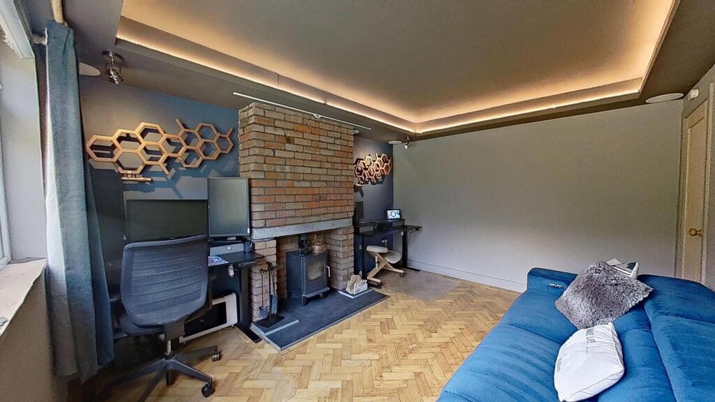 Inside, the spacious porch and bright hallway lead to a stylish living room with exposed brick fireplace, ambient lighting, asymmetrical designer radiators, and a built-in projector—perfect for cosy movie nights. The adjoining reception/dining room, with original parquet flooring and fireplace, offers flexible family space. A traditional kitchen features dark glossy worktops, breakfast bar, ample storage, and views onto the wrap-around garden. An additional rear porch and W/C cloakroom complete the ground floor.