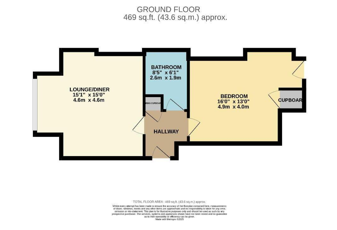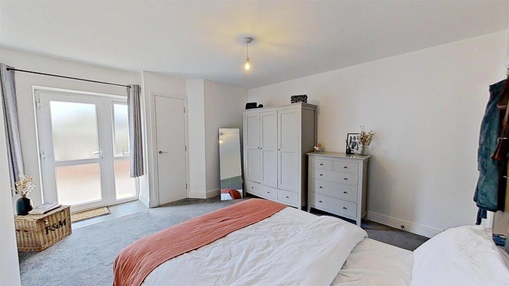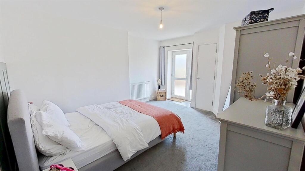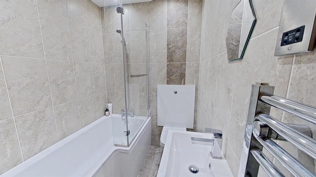 The bathroom is stylishly finished in neutral tones, featuring a clean white suite, a bath with overhead shower, and a glass panel that enhances the sense of space. The spacious bedroom boasts beautiful decorative panelling and generous storage options, while the hallway also offers additional storage.